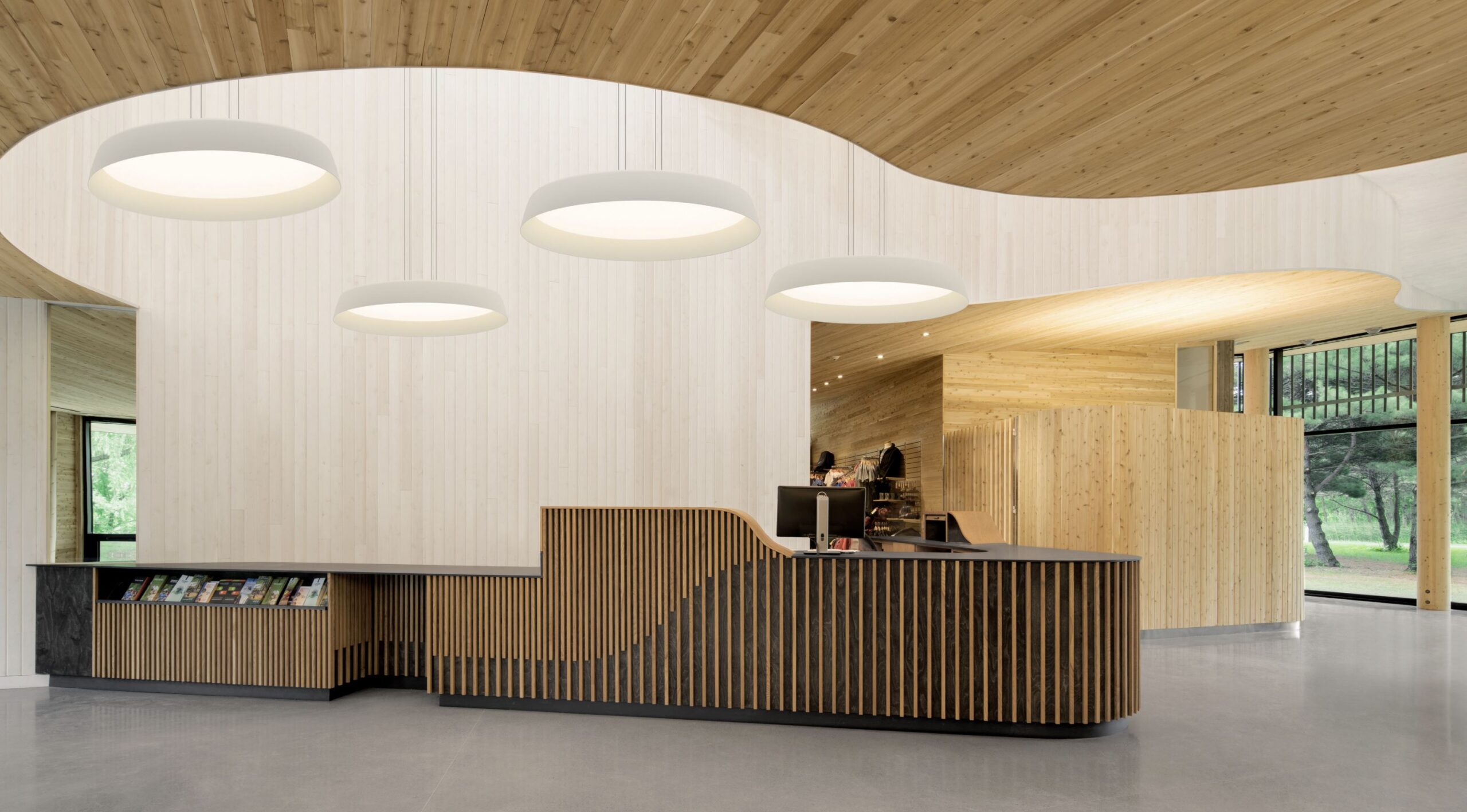 Bigger Pendant, designed by La Invisible for Vibia, consists—as the name suggests—of large pendants suspended by ultra-thin cables, creating a floating effect. Bigger is available in two versions: one with a slim shade and flat diffuser for soft, even lighting, and another with a wider shade and hidden diffuser for a more focused light.