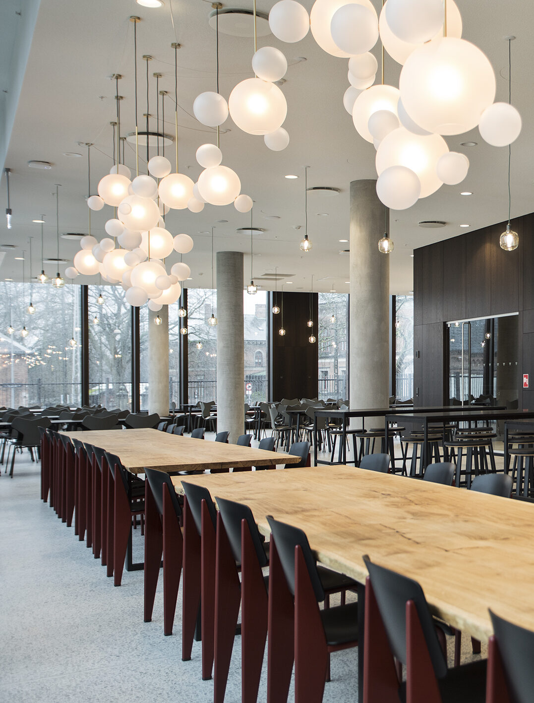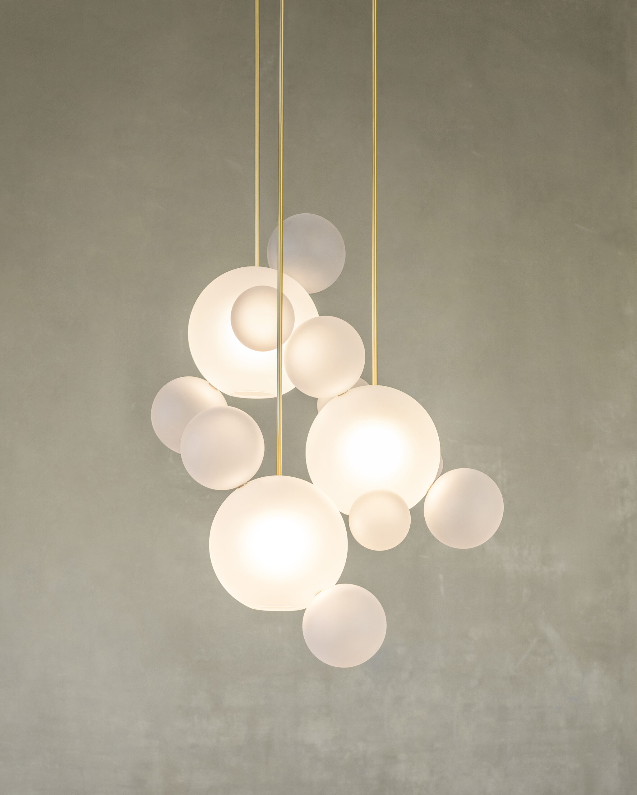 Bolle Frosted Chandelier by the Italian brand Giopato & Coombes is a series of pendants made from frosted, handblown glass with smaller glass bubbles screwed onto the surface, inspired by floating clouds. The Bolle collection is also available in smaller configurations – see Bolle Frosted Pendant.