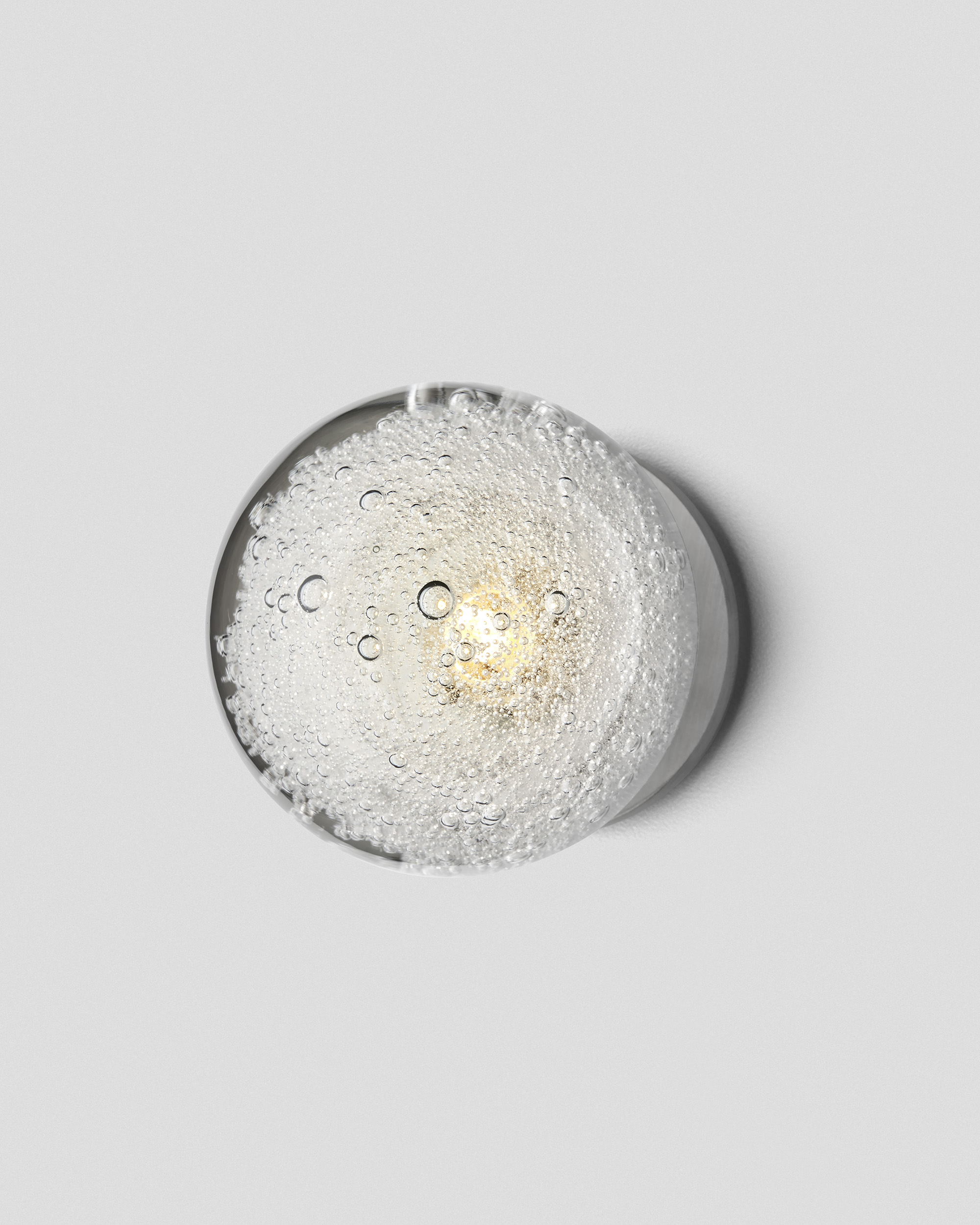 The elegant Fizi wall lamp from Articolo features small bubbles inside the glass that sparkle like champagne. Crafted from handmade glass and metal, it is a versatile choice for spaces ranging from bathrooms and bedrooms to restaurants and commercial settings.