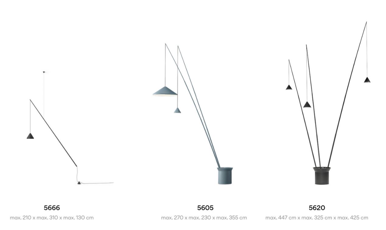 The North Floor Pendant, designed by Arik Levy for Vibia, consists of three different floor/pendant lamps with triangular aluminum shades and adjustable carbon fiber rods – see all three models and sizes in the gallery.