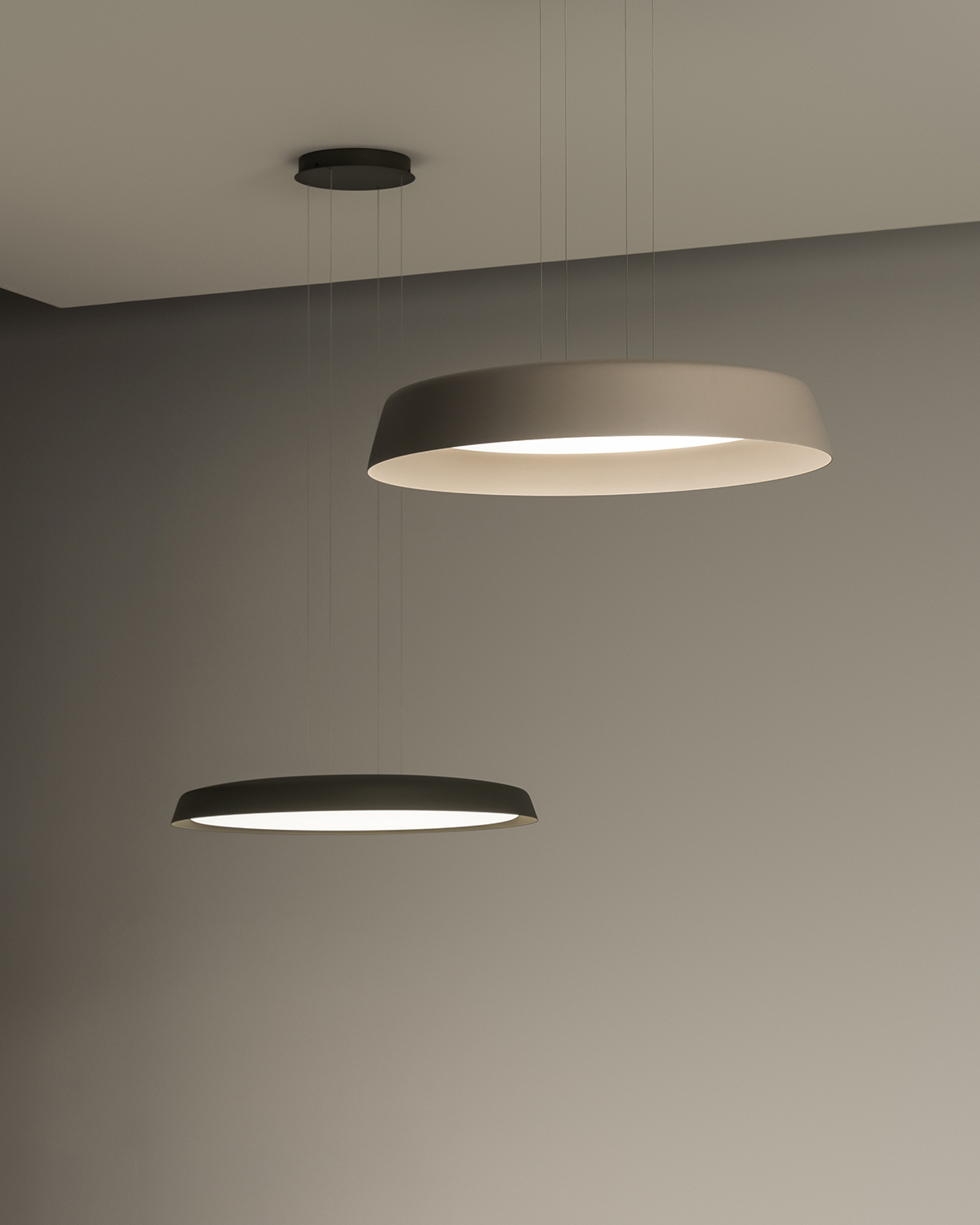 Bigger Pendant, designed by La Invisible for Vibia, consists—as the name suggests—of large pendants suspended by ultra-thin cables, creating a floating effect. Bigger is available in two versions: one with a slim shade and flat diffuser for soft, even lighting, and another with a wider shade and hidden diffuser for a more focused light.