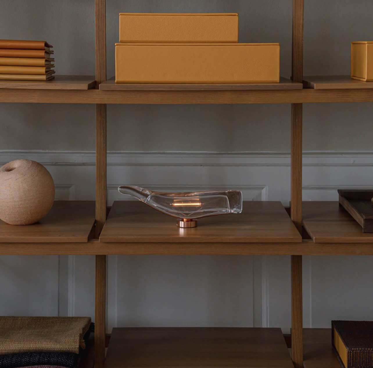 Cachalot is a sculptural lamp from the Japanese brand Ambientec, inspired by the shapes found in nature, with the shade shaped like a sperm whale. It is available with either a transparent or dark gray acrylic shade.