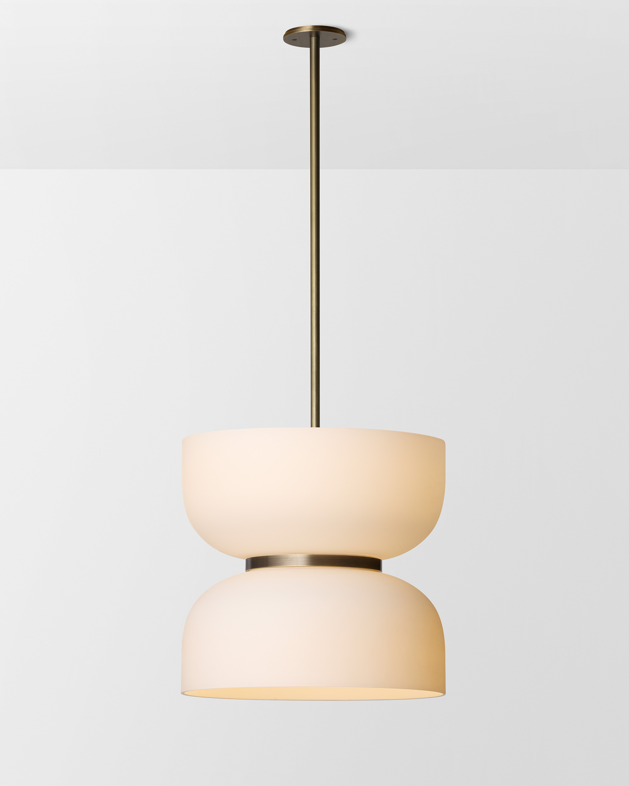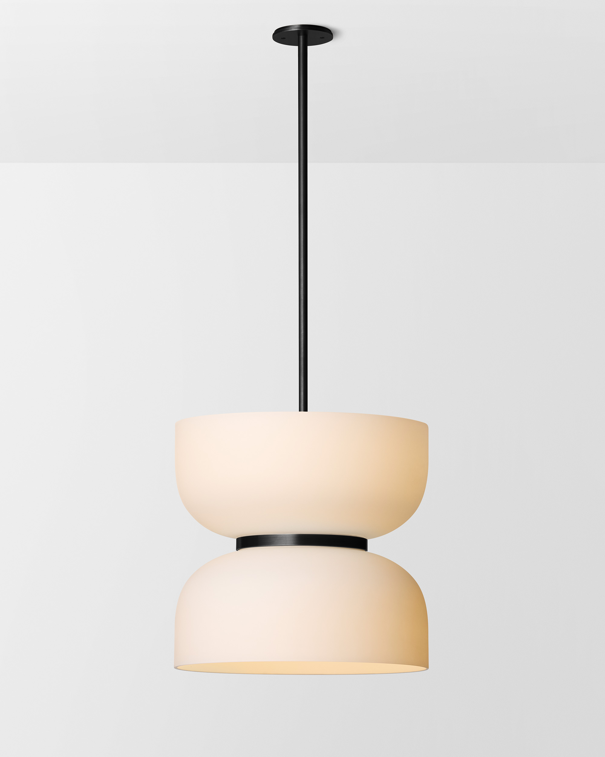 The Rolo Up Down pendant from Articolo draws inspiration from 1980s Milanese design, but with a modern, organic expression in either frosted or colored glass. The pendant is available in two sizes.