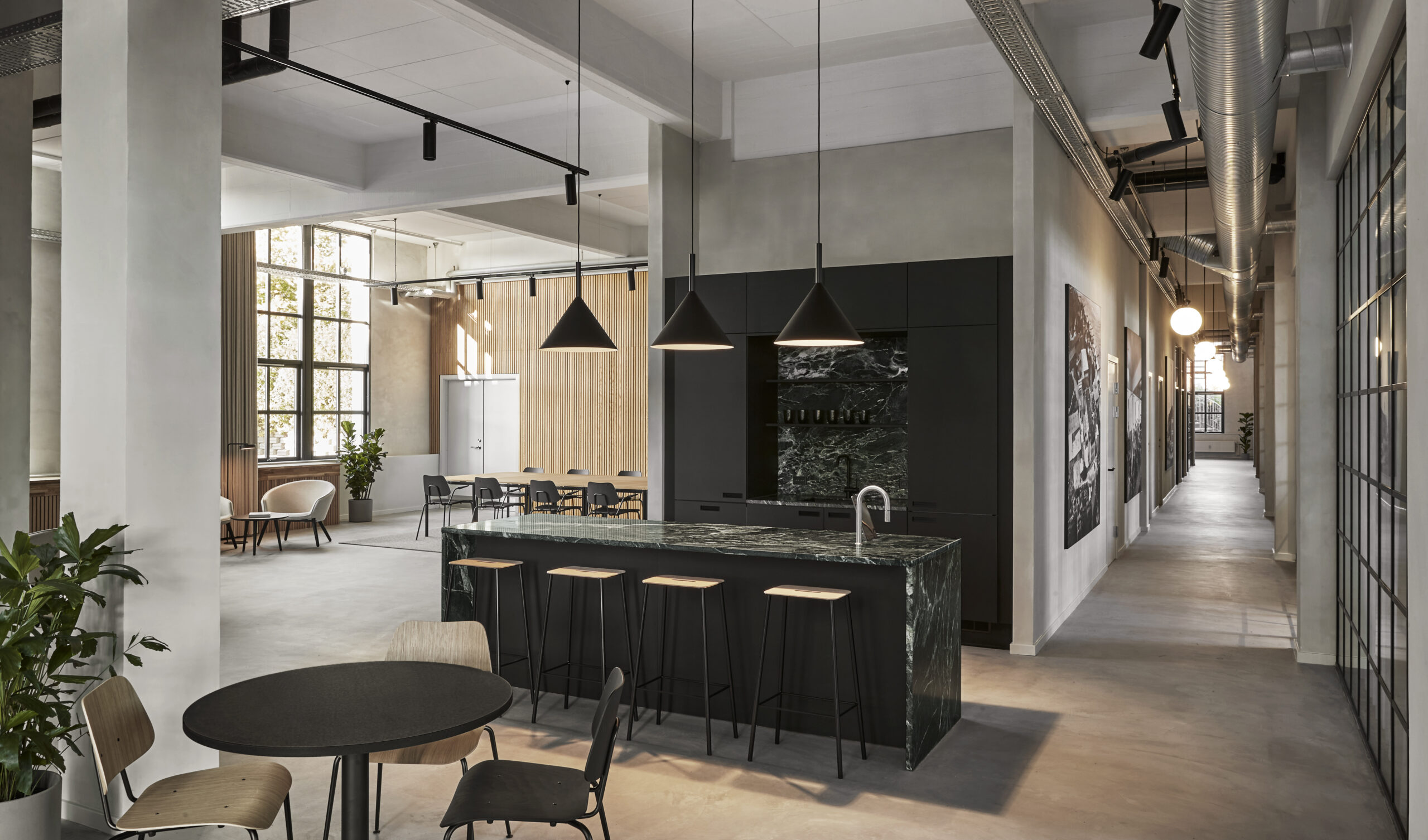 At the historic textile factory in Hellebæk, we collaborated with WERK Architects to design a lighting plan that complements the architecture and industrial interior design.