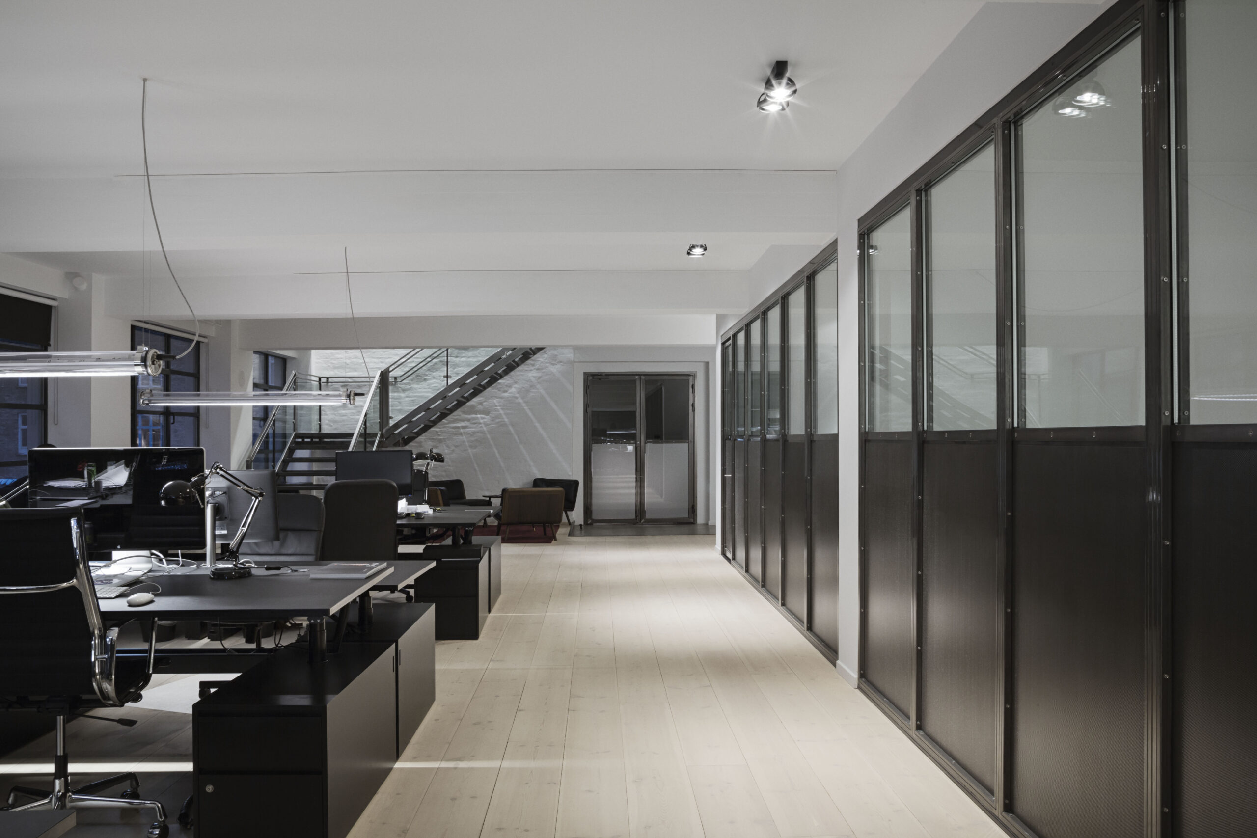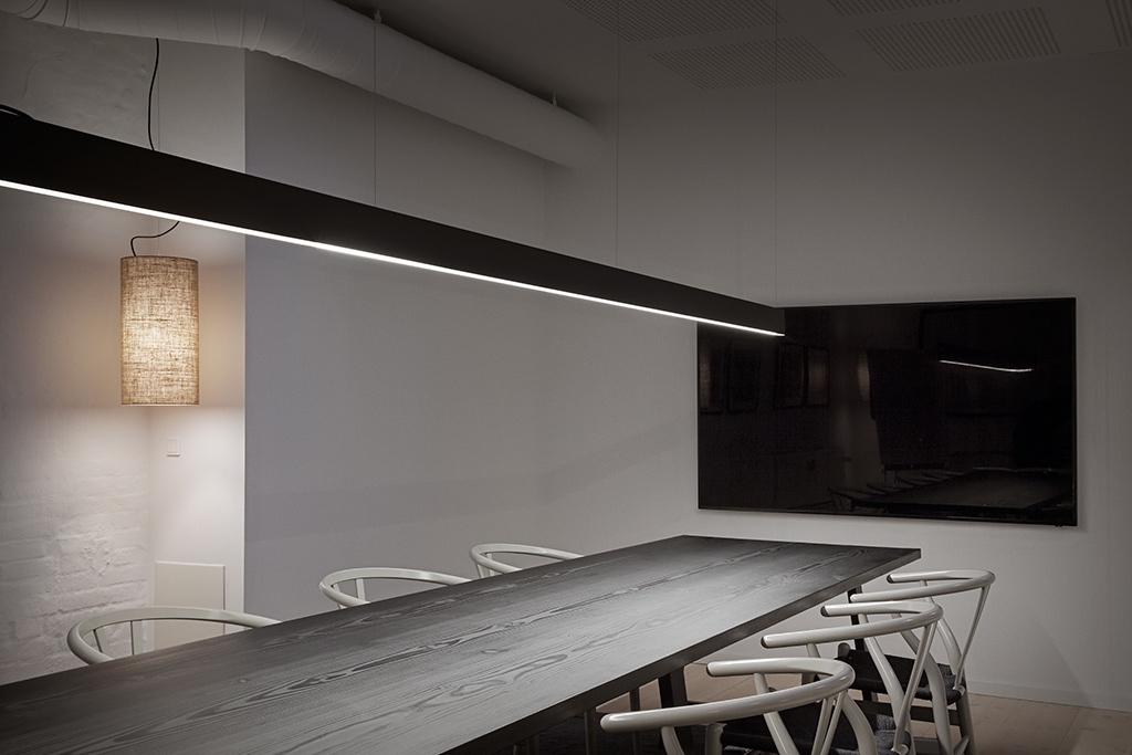 For a larger office on Indre Østerbro, we developed a customized lighting plan that combines profiles, fixtures, and surface-mounted spots from Delta Light and Sammode.