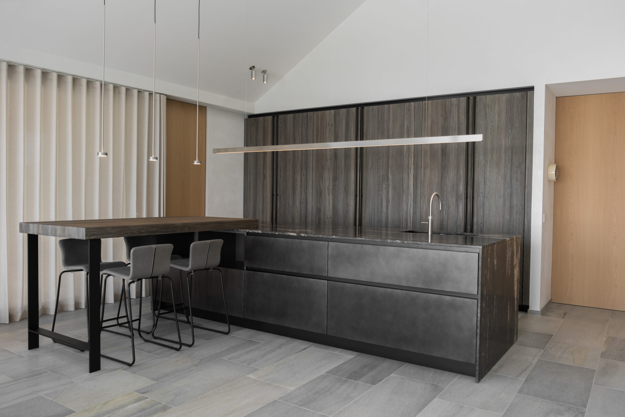 To create a cohesive theme in the lighting design, all fixtures feature the same matte nickel finish. The 60/100 Coverplate from Faustlight and Storm Medium Short 25 have been chosen as the primary surface-mounted and recessed spotlights for the technical base lighting throughout the house. Above the dining table in the kitchen hangs the iconic Bolle Chandelier Circular, featuring 24 transparent borosilicate glass spheres, while the high table is illuminated by the sleek and elegant Softspot pendants – both from Giopato & Coombes.