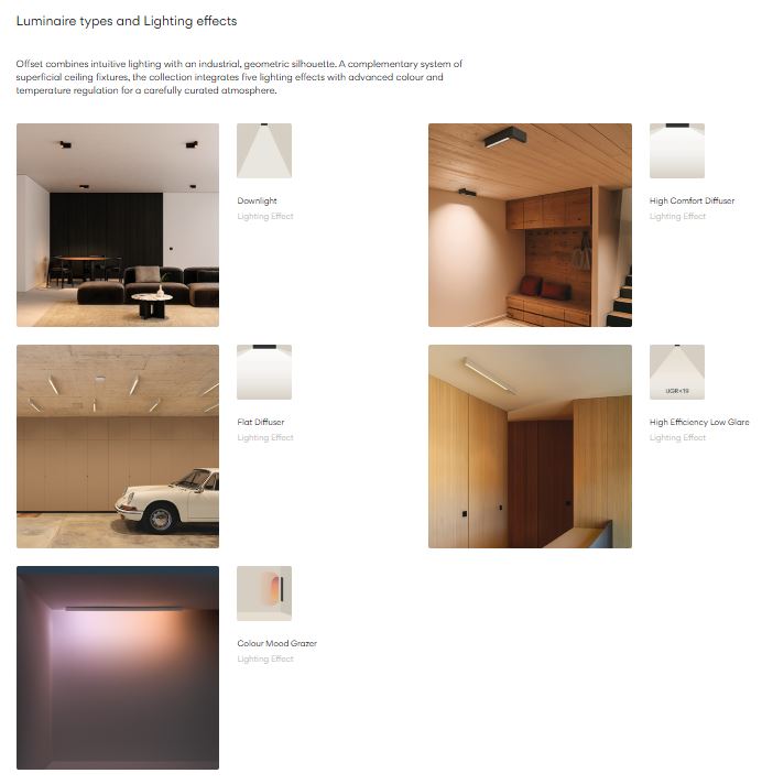 Offset, designet af Xuclà for Vibia, består af overflademonterede loftarmaturer med fem forskellige belysningseffekter. Offset systemet fås i flere længder, former og finishes.