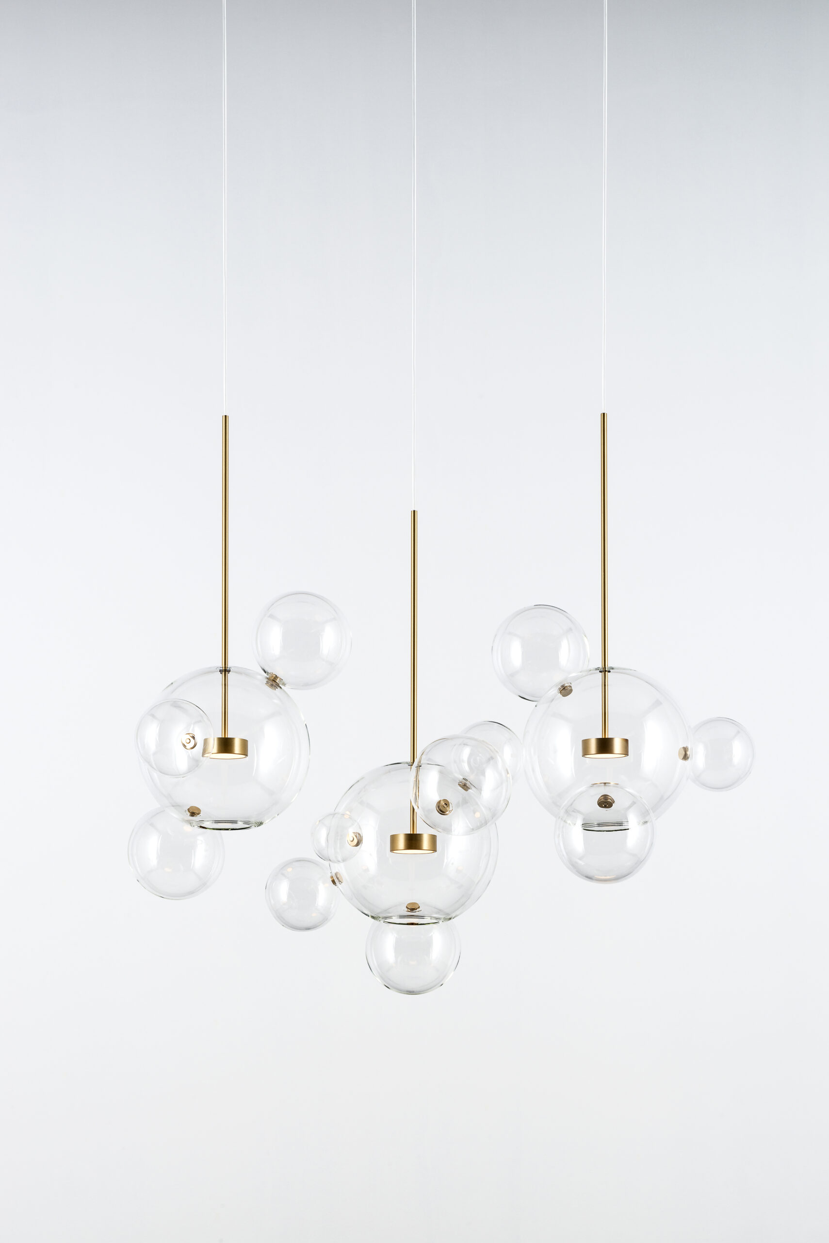 Bolle Chandelier fra det italienske brand Giopato & Coombes er en serie af pendler i transparent, mundblæst glas med påskruede, mindre bobler af glas, inspireret af sæbebobler. Bolle-kollektionen fås også i mindre konstellationer – se Bolle Pendant.