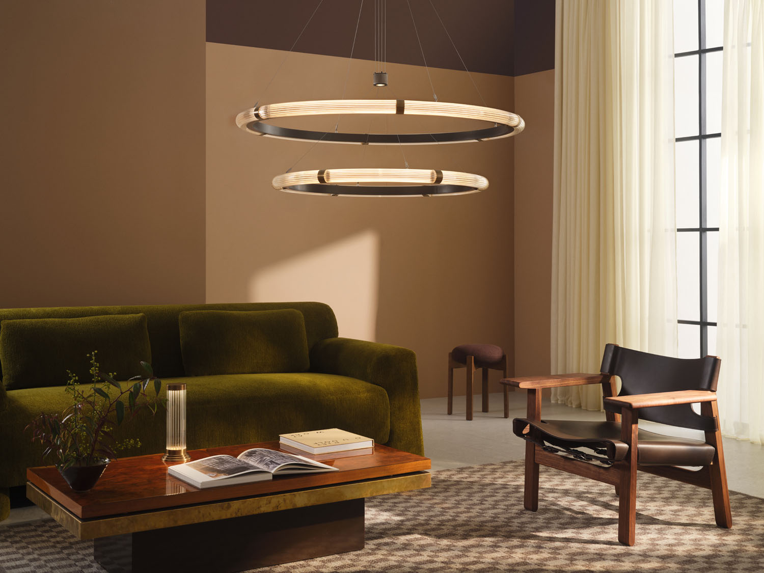 Strata Circular Two-Tier Pendant fra J. Adams & Co er en udvidelse af den eksisterende Strata kollektion. Pendlen kombinerer to riflede glas- og messing ringe i en skulpturel og moderne konstellation. En indbygget spotlight giver ekstra lys nedad, hvilket gør lampen velegnet til høje rum som trappeopgange, foyerer og større stuer.