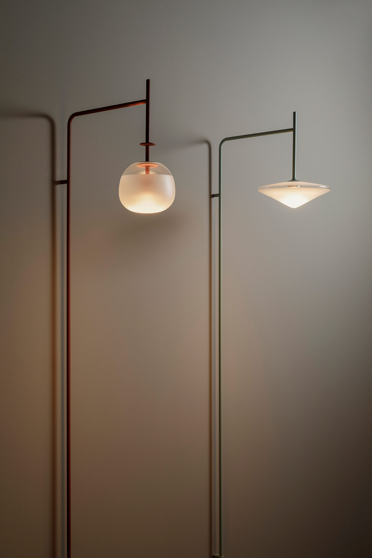 Tempo Wall Short Arm er en slank og minimalistisk væglampe designet af Lievore Altherr for Vibia. Væglampen kommer i tre forskellige mundlæste glas designs – disc, diamond eller oval, som alle leger med lyset i samspillet mellem transparent og matteret glas. Alle tre designs fås i Vibias faste farvepalette. Tempo kommer også i en væg version med lang arm.