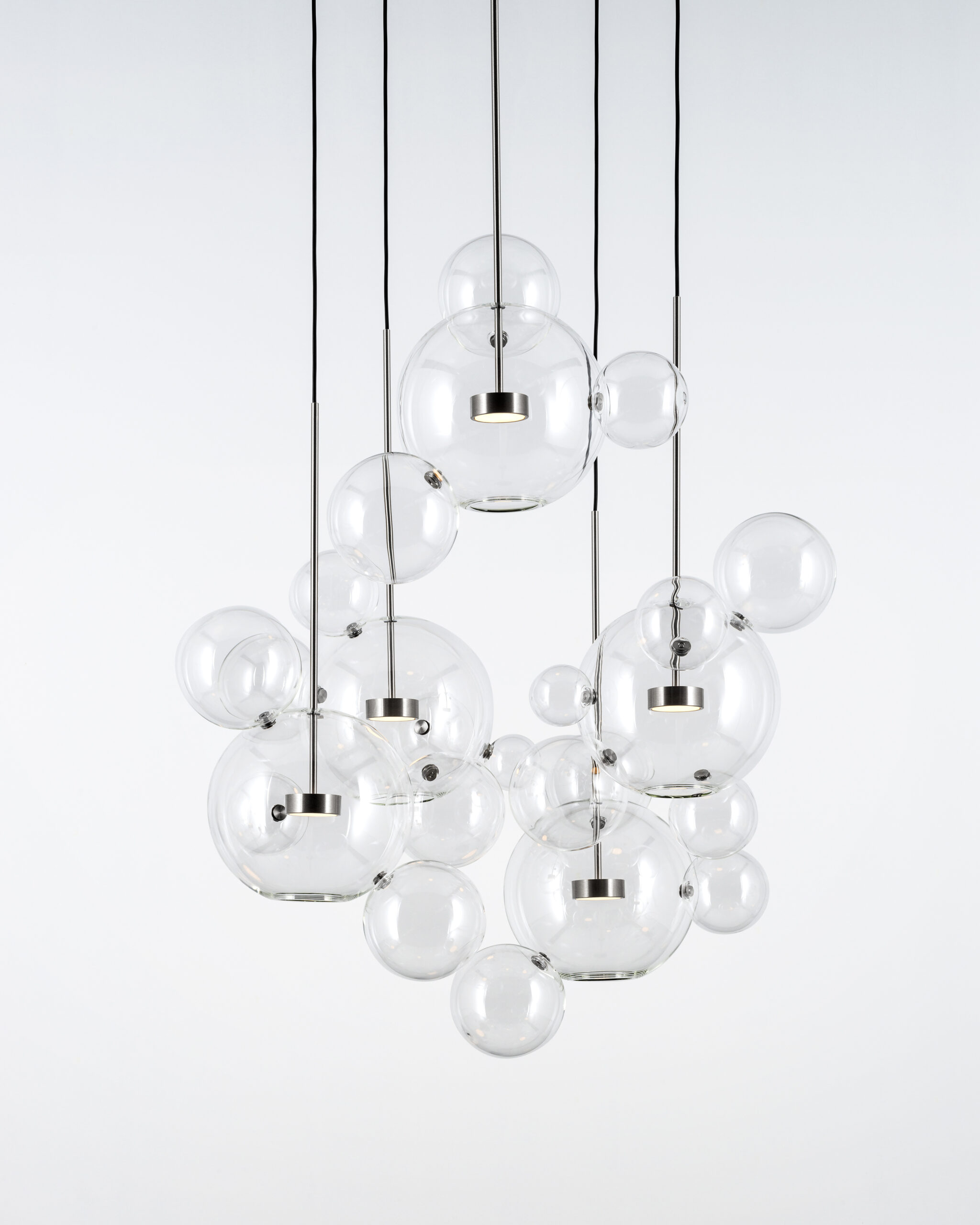 Bolle Chandelier fra det italienske brand Giopato & Coombes er en serie af pendler i transparent, mundblæst glas med påskruede, mindre bobler af glas, inspireret af sæbebobler. Det transparente glas kan også fås med en subtil metallisk farvetone i forskellige nuancer. Bolle-kollektionen kommer derudover også i en pendel version – se Bolle Pendant.