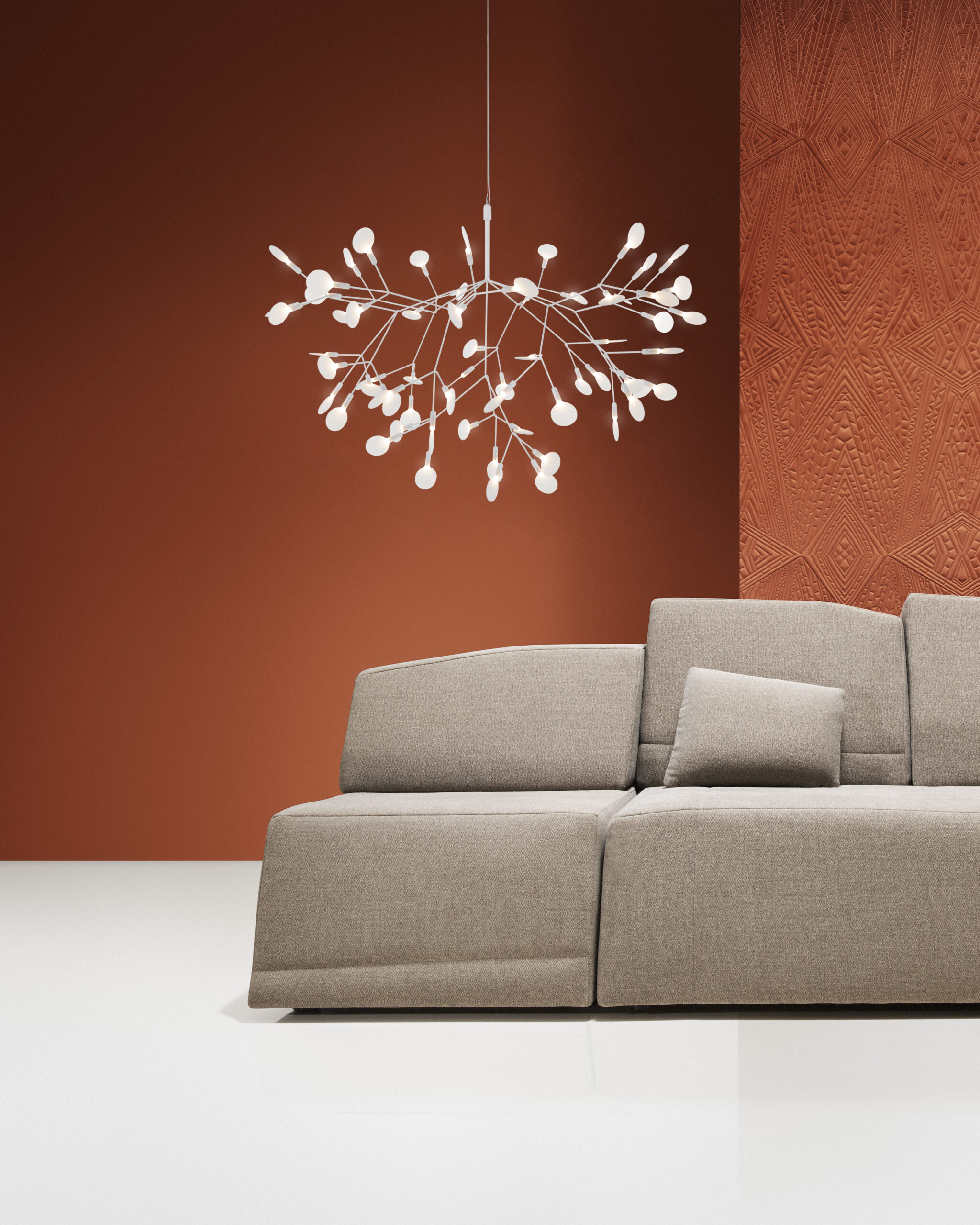 Heracleum III Suspended fra Moooi er en elegant og let pendel inspireret af planten Heracleum. De fine grene bærer små, lysende blade, der skaber et organisk og luftigt udtryk. Med den innovative Electrosandwich®-teknologi fra Marcel Wanders Studio får designet et rent og minimalistisk look uden synlige ledninger.