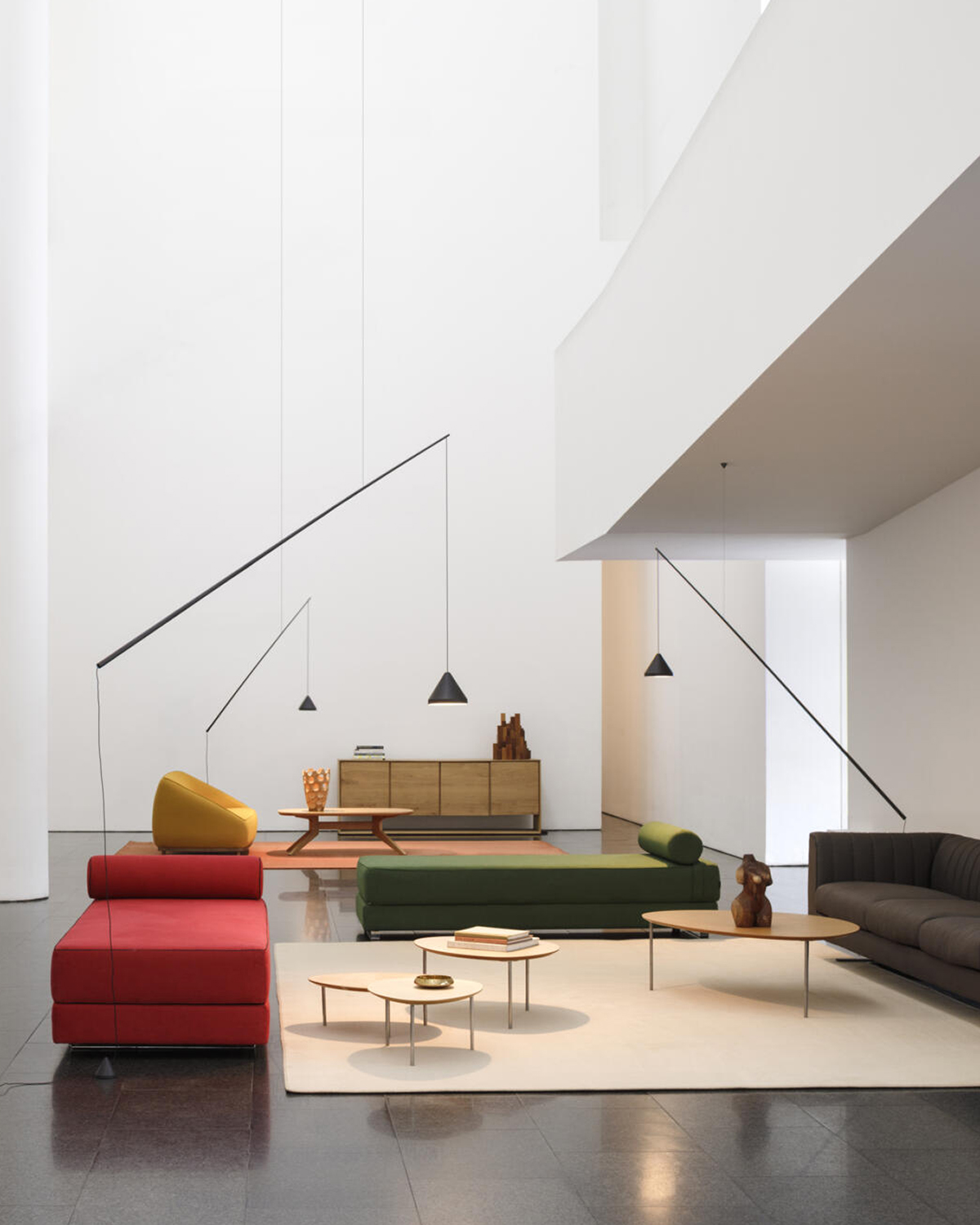 North Floor Pendant, designet af Arik Levy for Vibia, består af tre forskellige gulv/ pendler med trekantede aluminiums-skærme og justerbare carbonfibre-stænger – se alle tre modeller og størrelser i galleriet.
