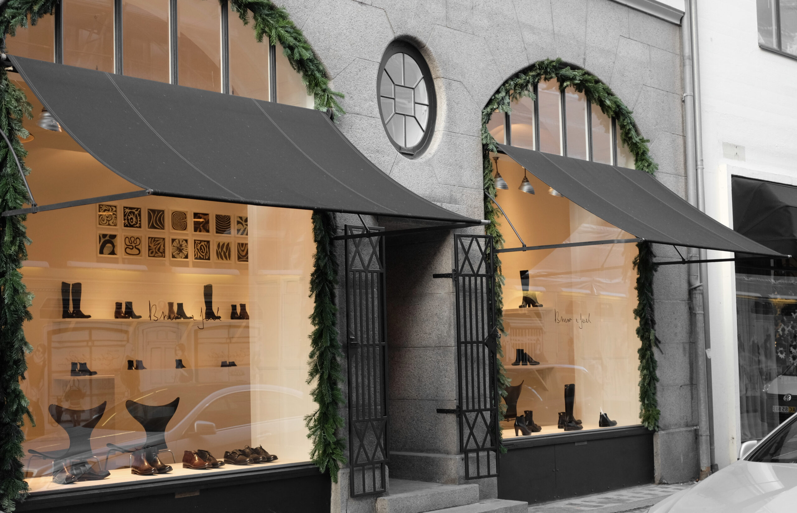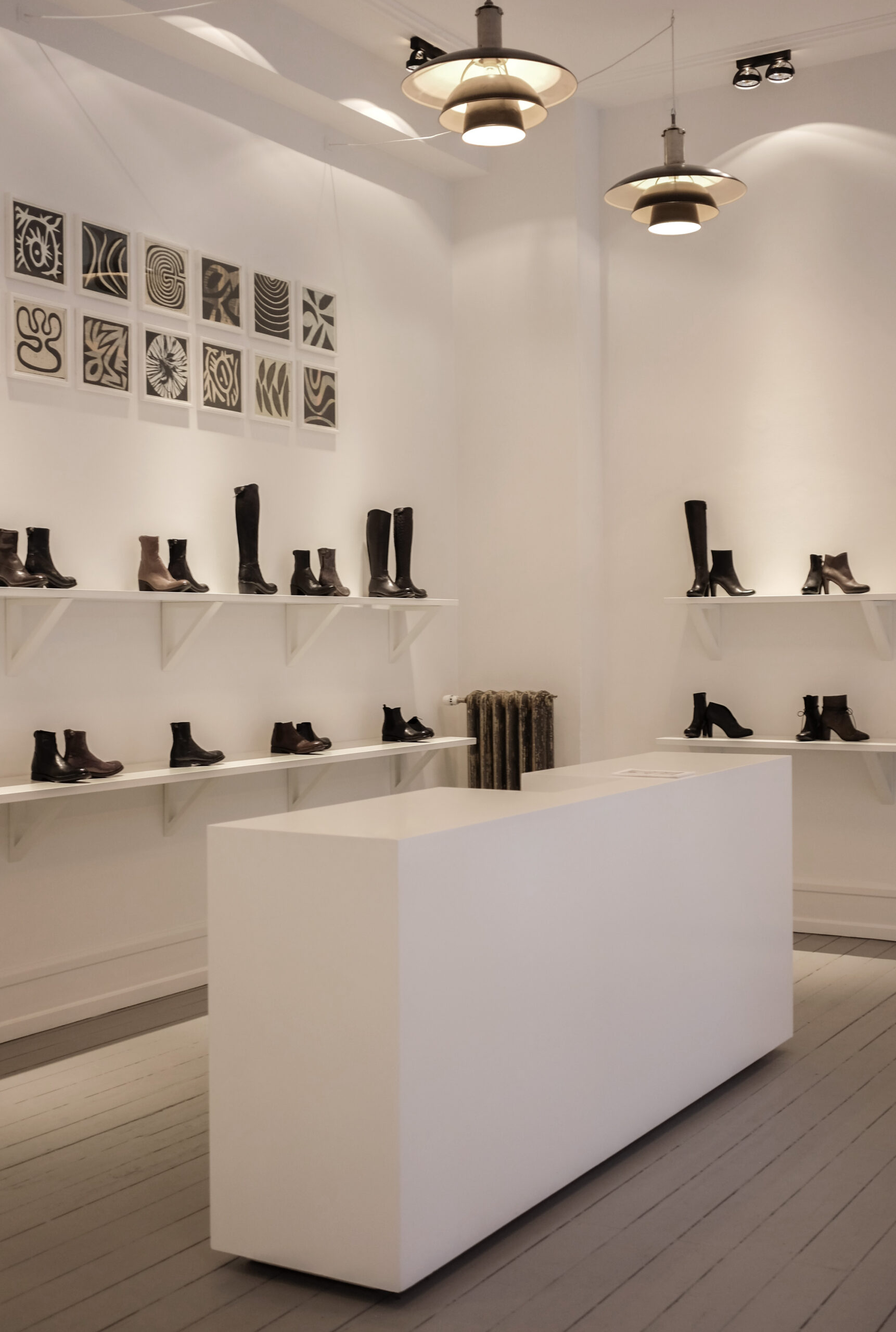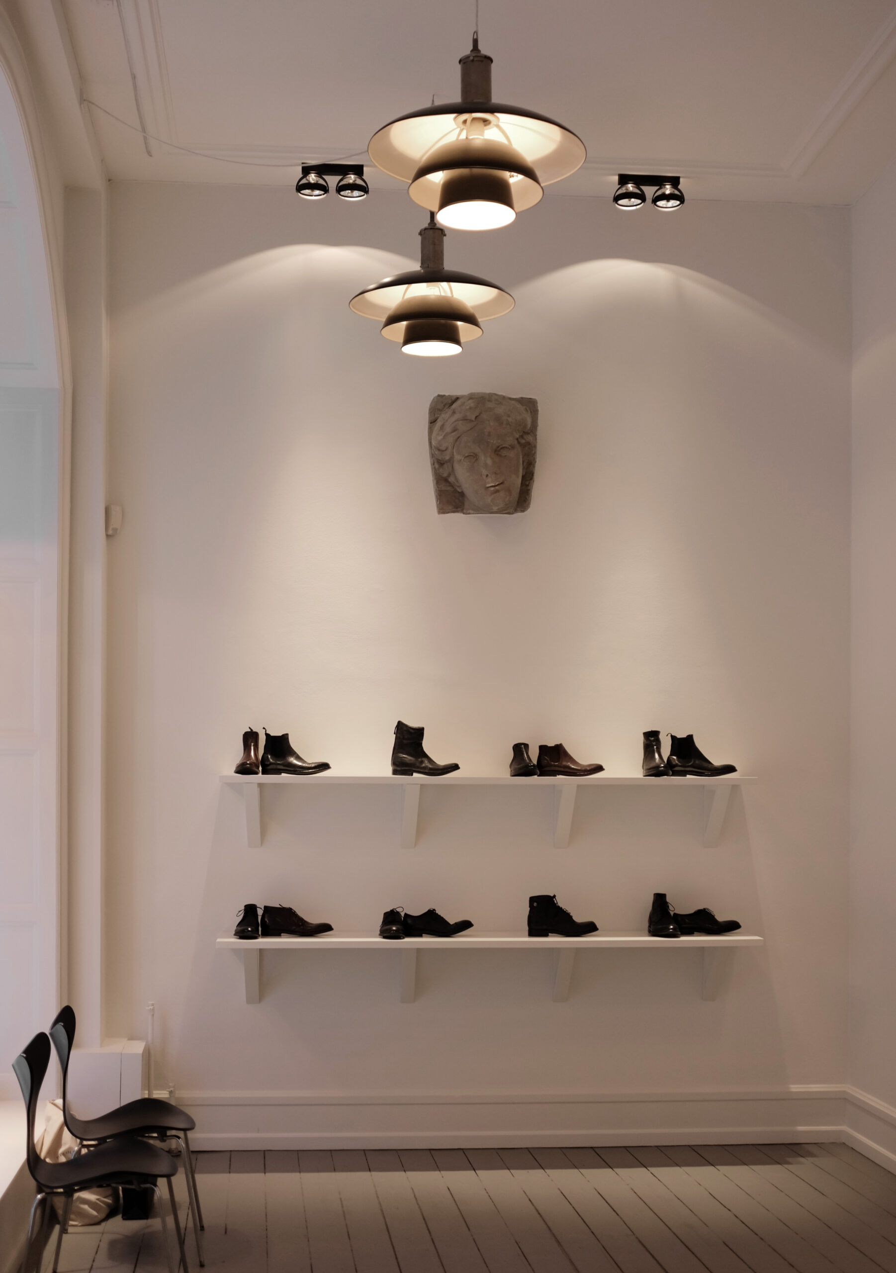 I den lille skobutik Bruno & Joel, der kendetegnes ved klassiske og enkle designs, har vi leveret de tidløse påbygningsspots Rand fra Delta Light, som harmonerer med butikkens interiør og supplerer den dekorative belysning.