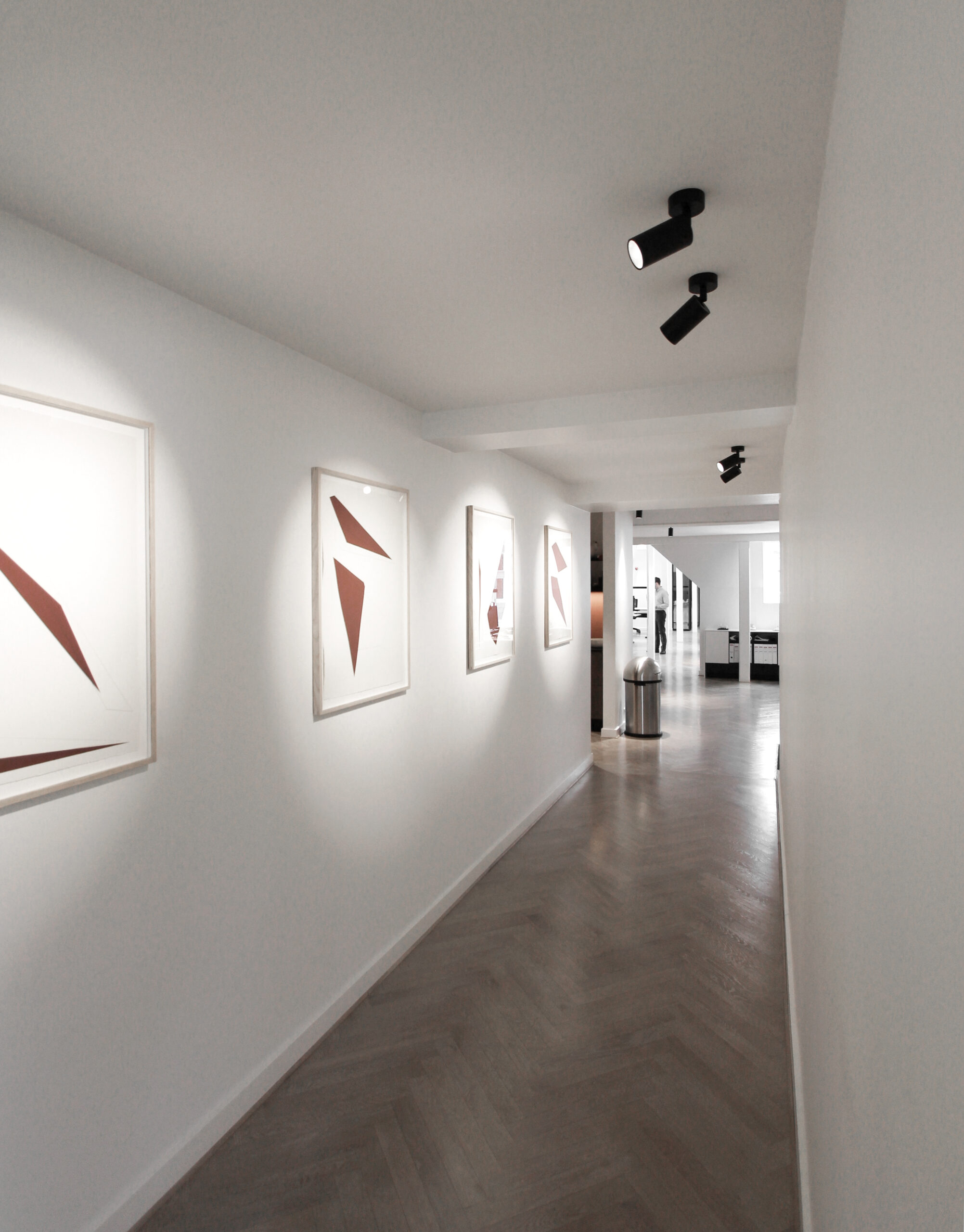Vi har valgt de minimalistiske Super-Oh-pendler fra Delta Light, suppleret med skinnesystemer, der giver mulighed for at justere og vinkle lyset i den ønskede retning.