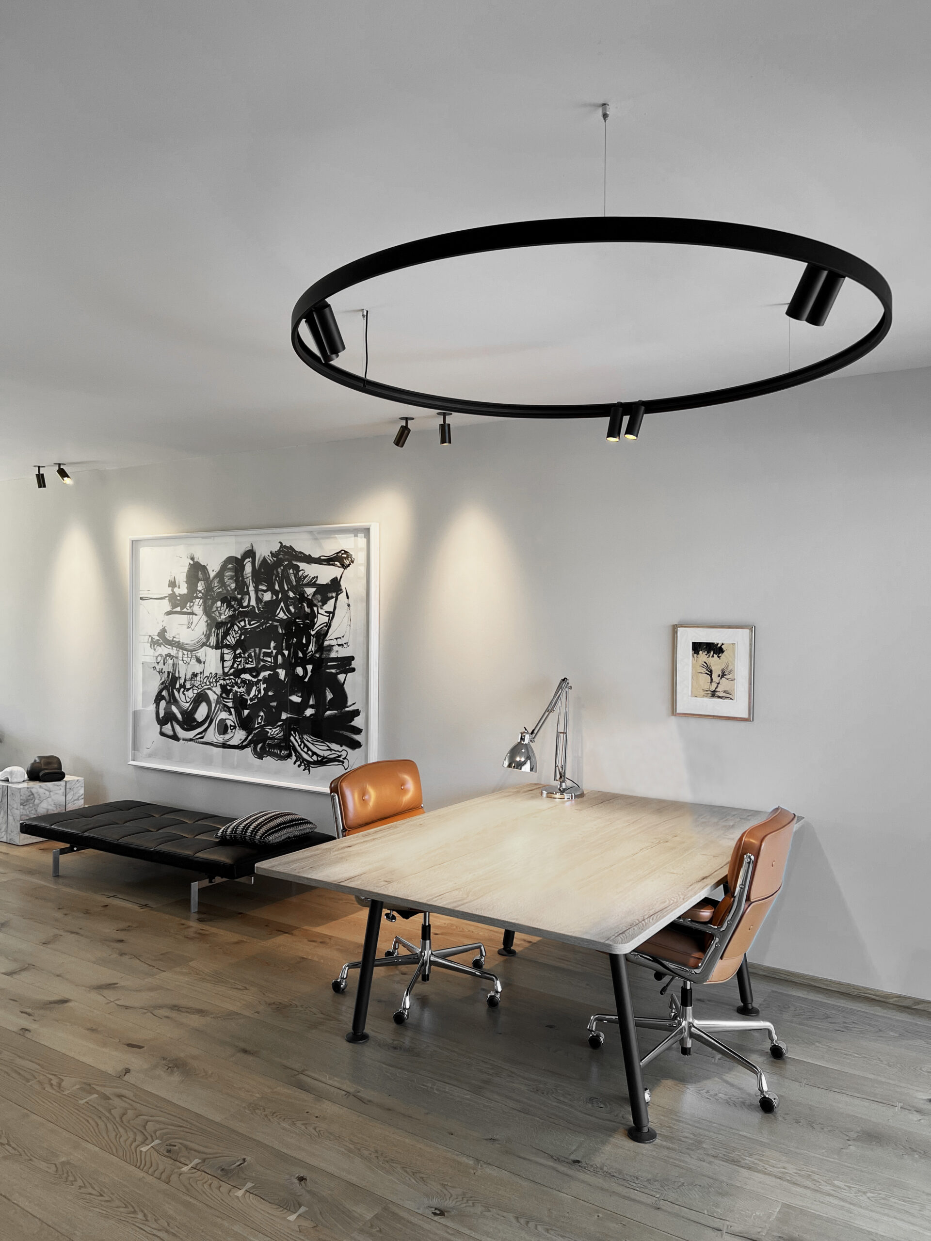 Den eksklusive garage er blevet installeret med de industrielle armaturer Vendôme og Purcell fra franske Sammode.