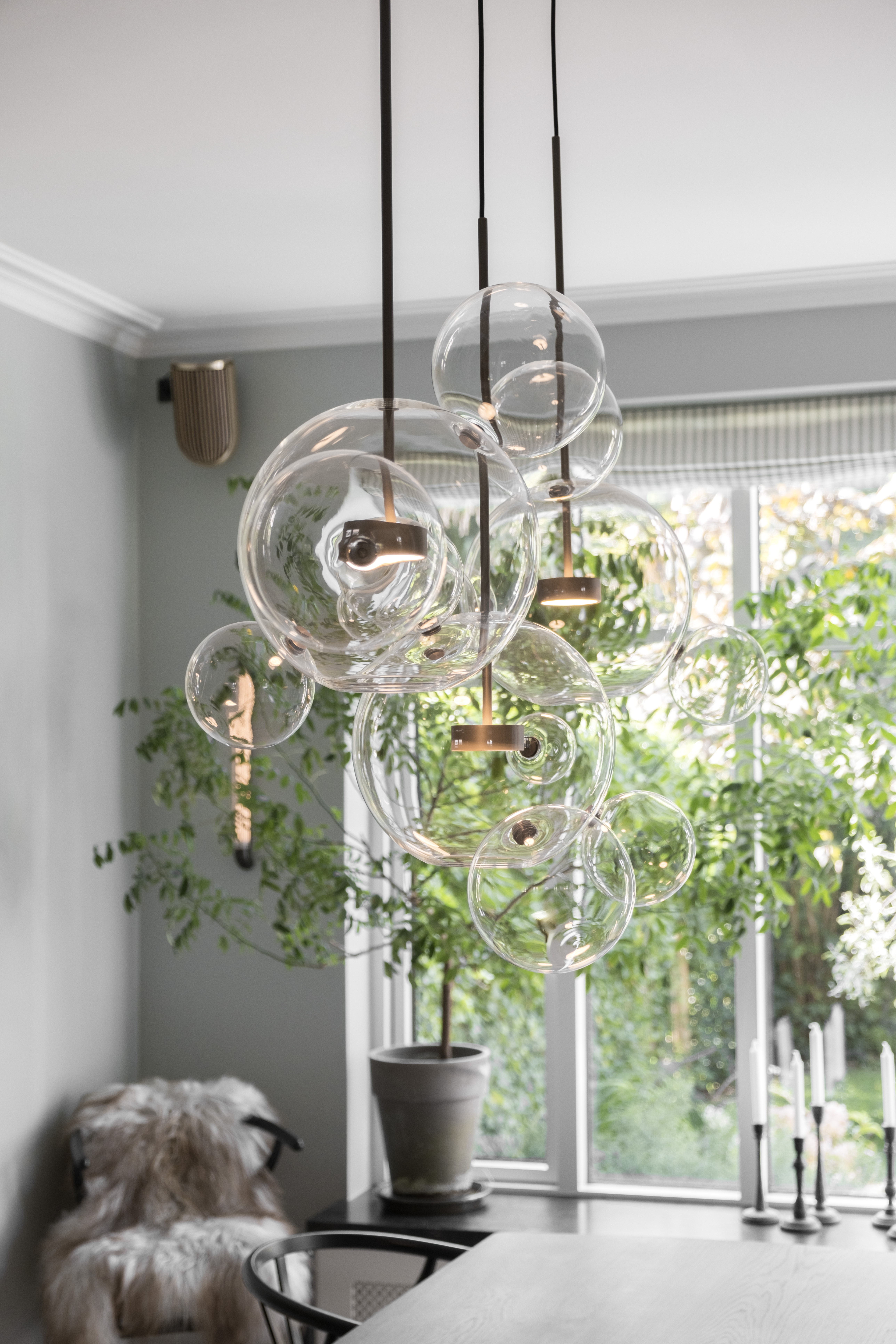 I køkkenet og spisestuen har vi tilføjet de dekorative væglamper Strata Wall fra J. Adams & Co til at give et stemningsfuldt lys, mens den ikoniske Bolle Chandelier Linear 14 fra Giopato & Coombes hænger over spisebordet. Køkkenøen er belyst af de smalle, elegante Softspot Pendants, alle lamper med en bruneret finish.