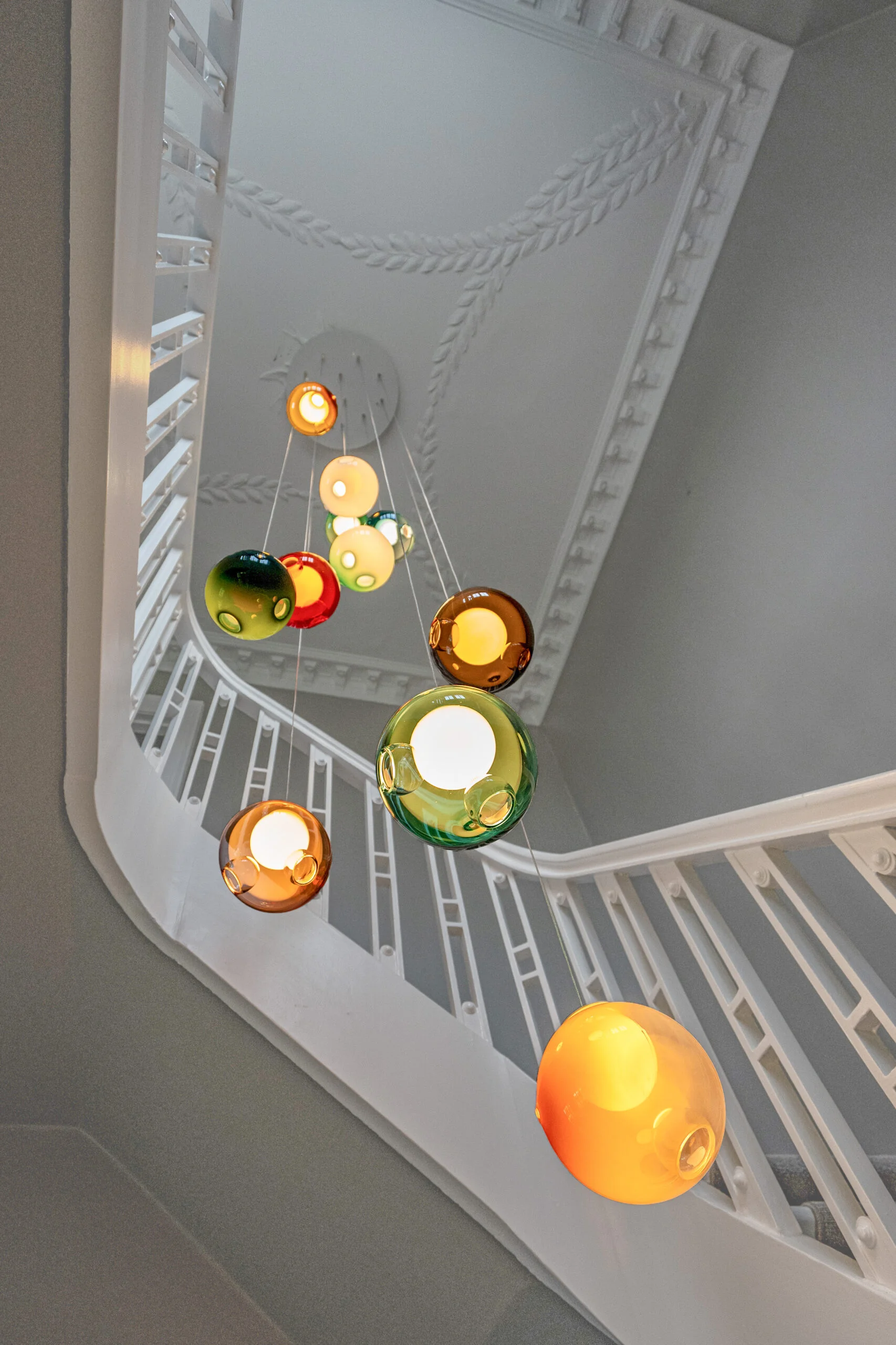Resultatet er en kombination af dekorative pendler, der harmonerer med villaens interiør fra blandt andet Il Fanale og Bocci, suppleret med teknisk belysning fra Delta Light.