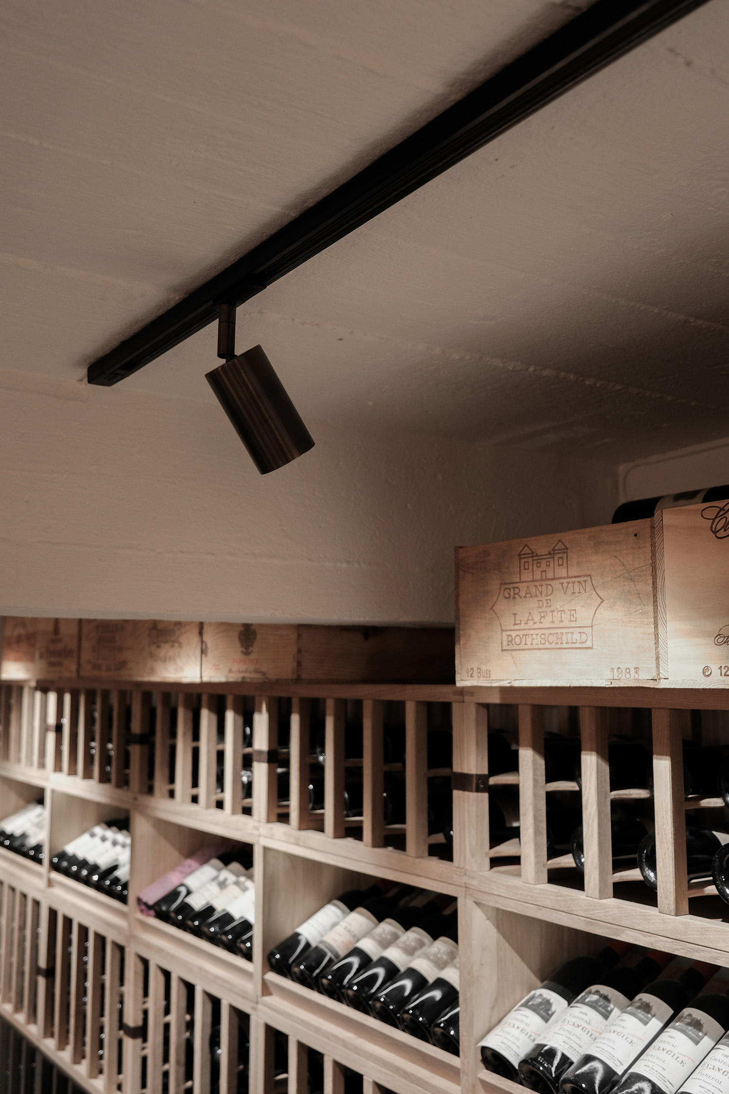 Den kipbare 60/100 Track spot fra Faustlight giver mulighed for at justere lysretningen individuelt for hver spot på skinnen. For at supplere den tekniske belysning har vi desuden tilføjet de rustikke London pendler fra italienske Il Fanale, som passer til vinkælderens øvrige interiør.